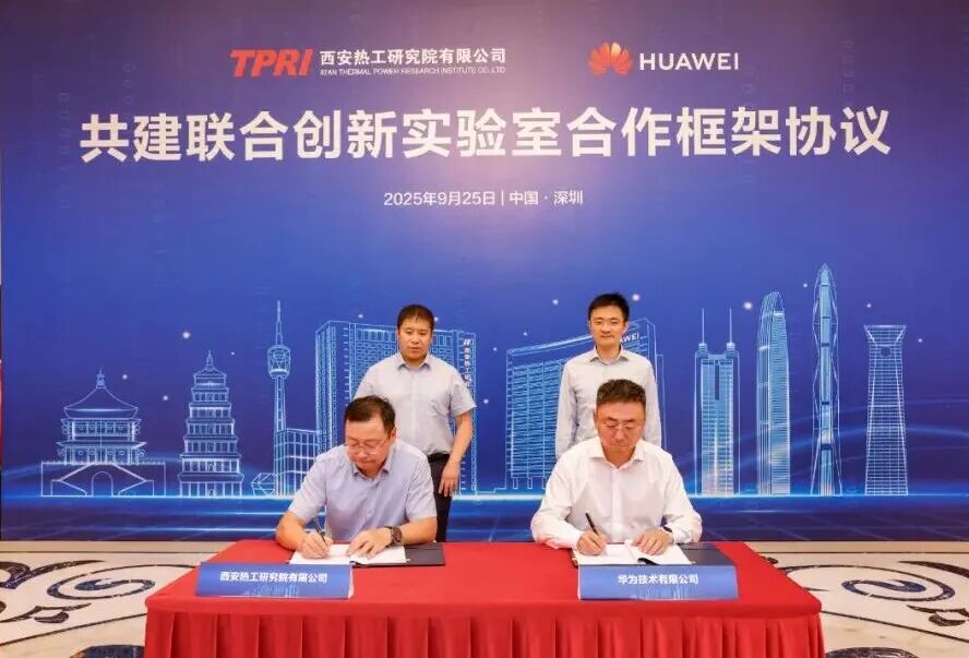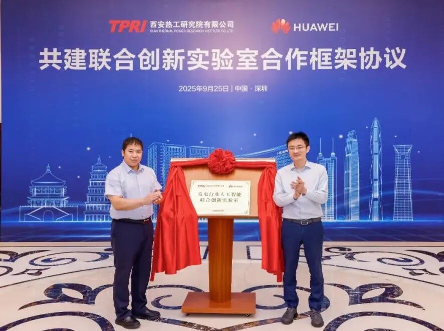 [中国,深圳,2025年9月25日]西安热工研究院有限公司(以下简称“西安热工院”)与华为技术有限公司(以下简称“华为”)在深圳华为总部正式签署共建人工智能联合创新实验室合作框架协议。西安热工院副总经理梁法光与华为中国政企电力业务部总经理李继光代表双方签署协议,西安热工院党委副书记、总经理丹慧杰、华为ICT Marketing与解决方案销售副总裁史振钰等出席并见证协议签署,共同为西安热工院-华为联合创新实验室揭牌。